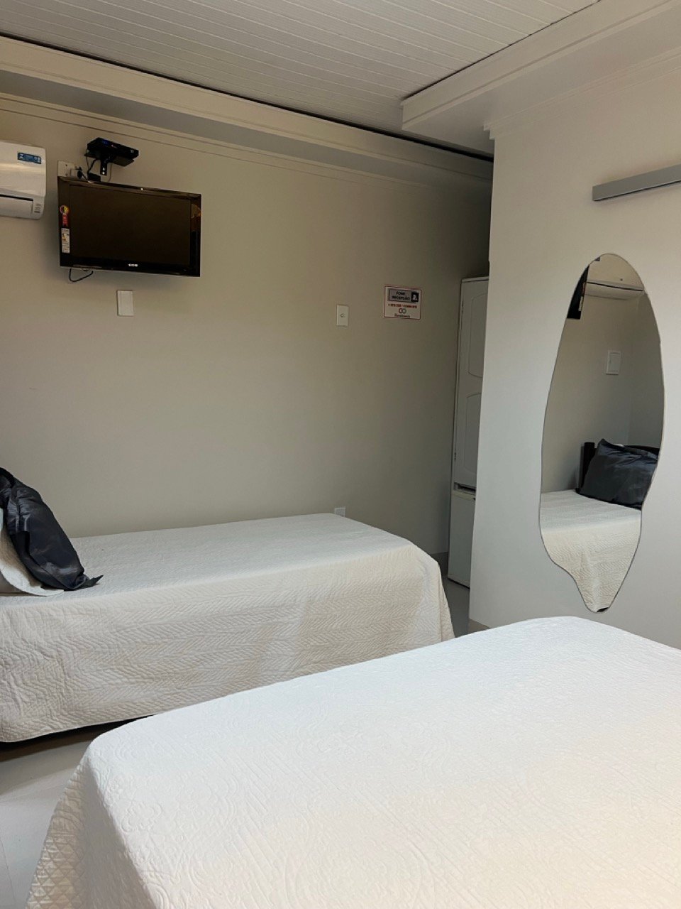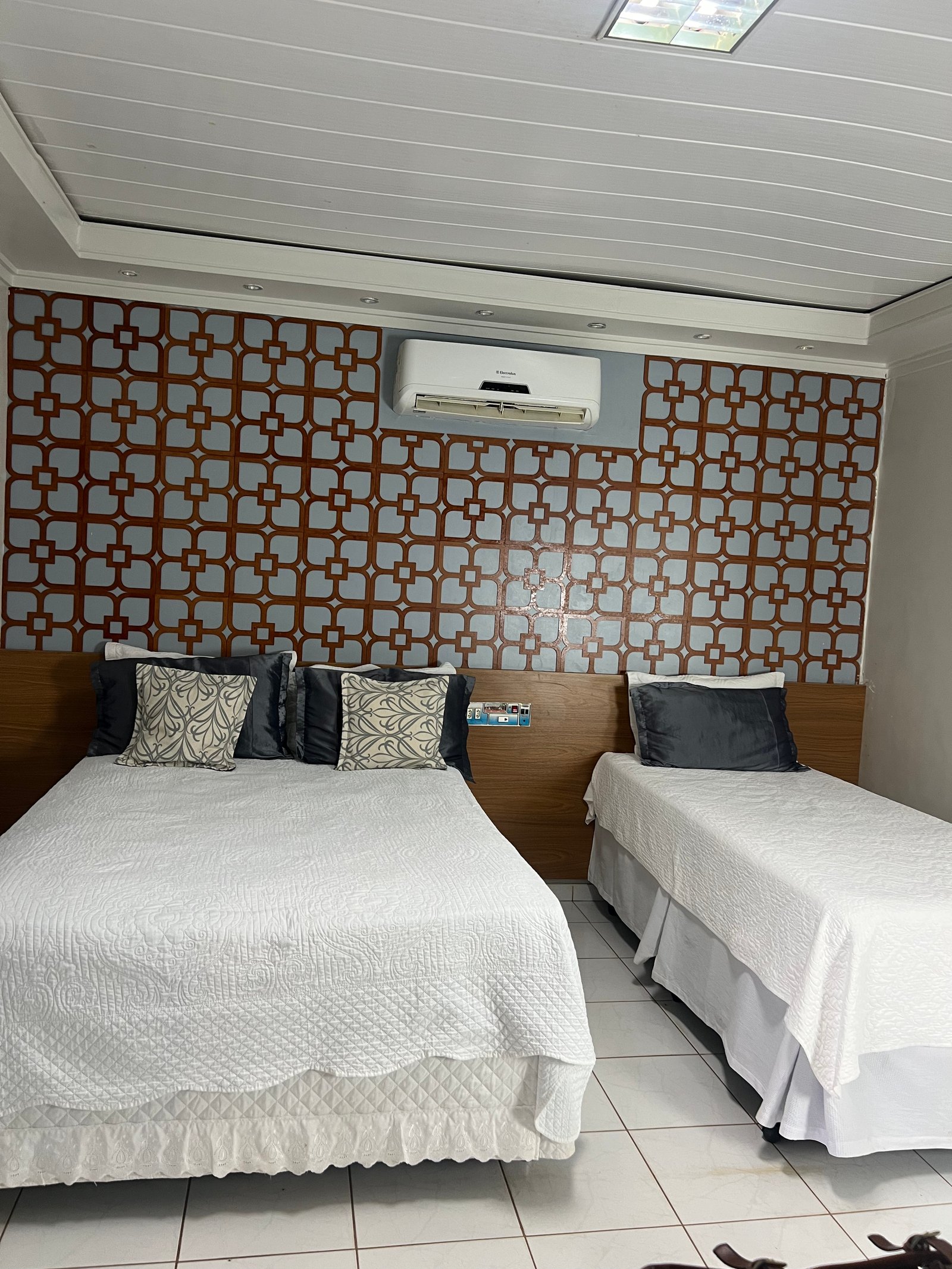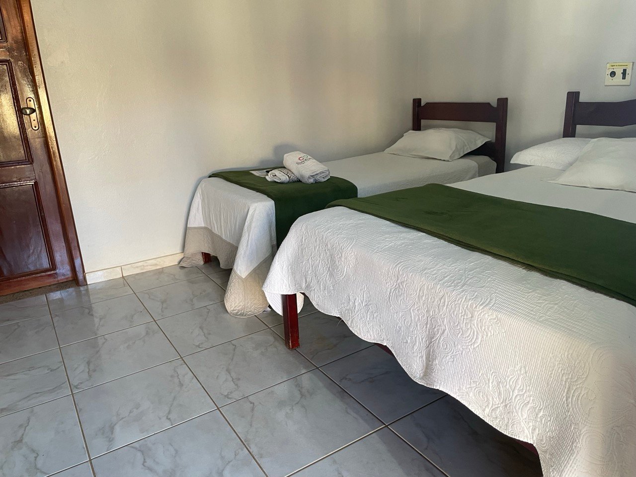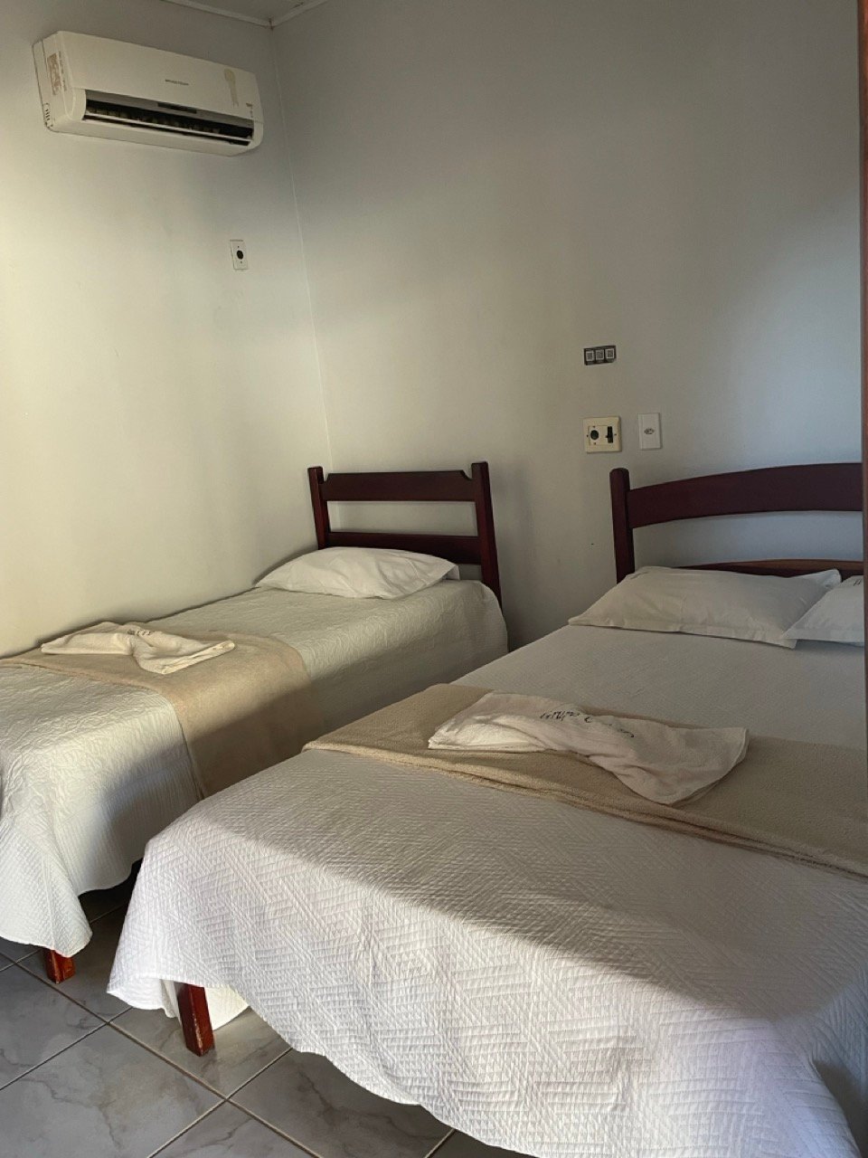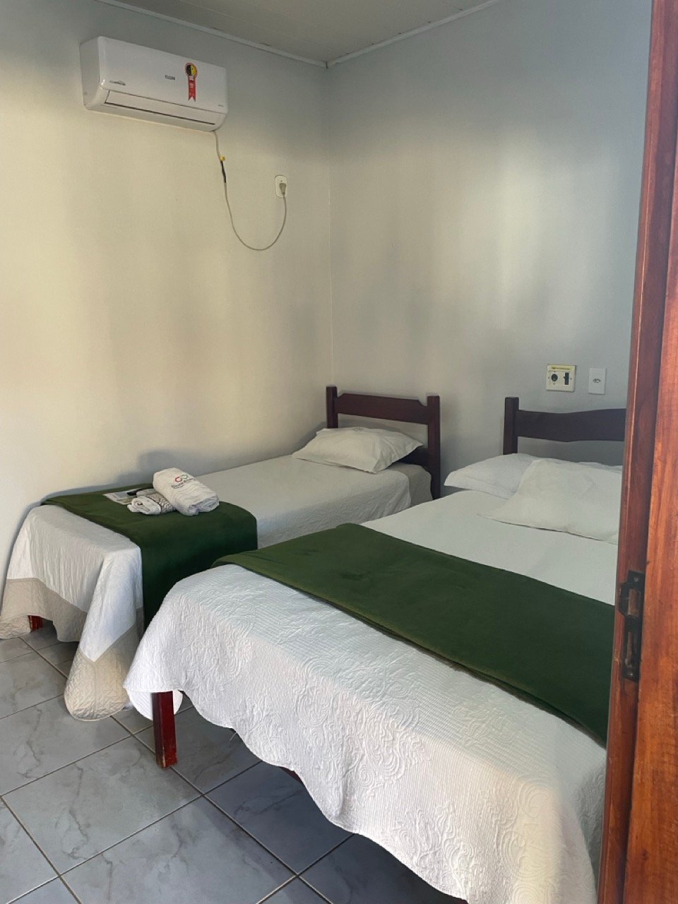 Acomodações confortáveis com 1 cama de casal, 1 cama de solteiro, TV com canais abertos, ar-condicionado, Wifi e estacionamento privativo. Perfeito para quem busca economia e praticidade.