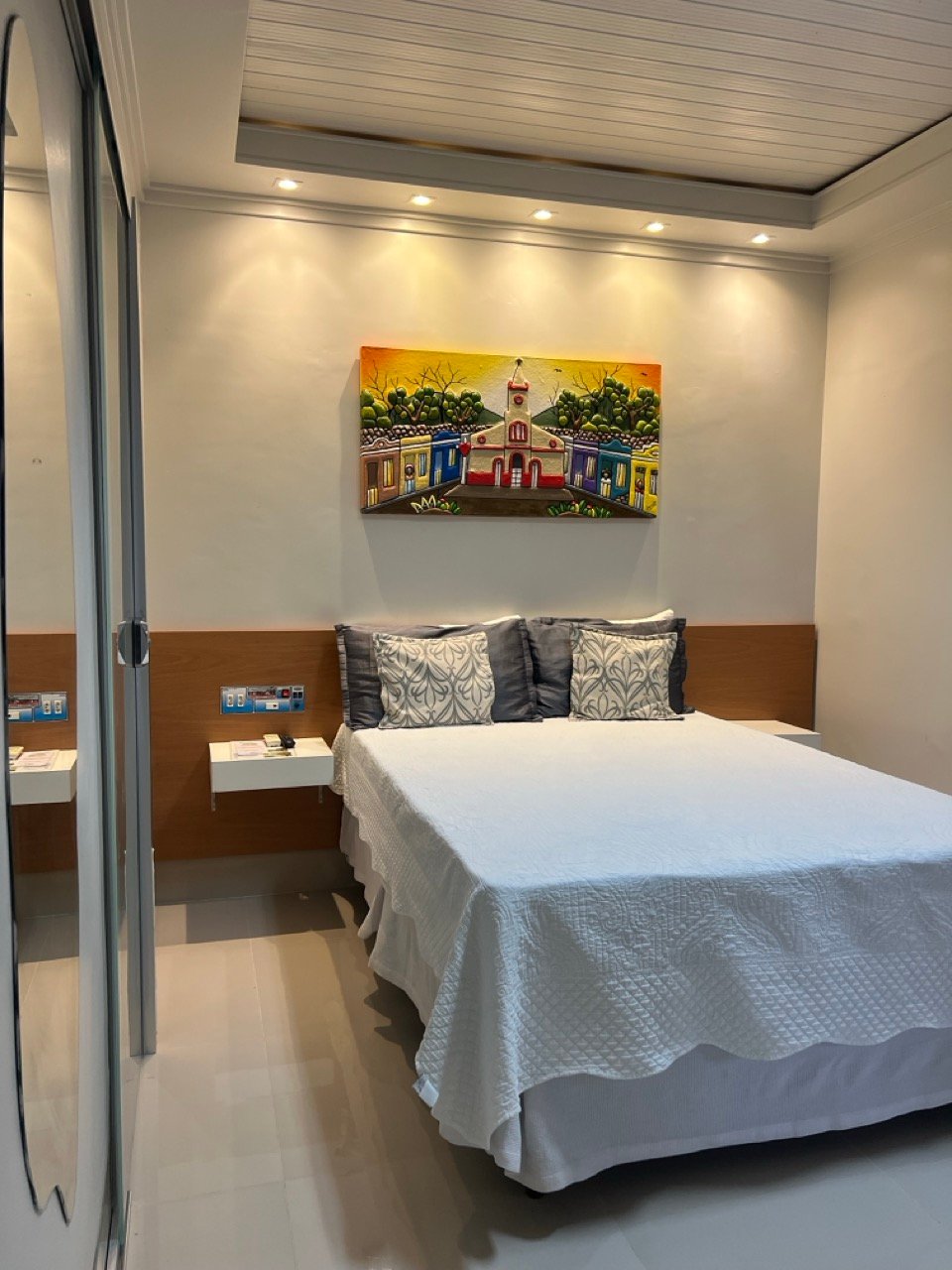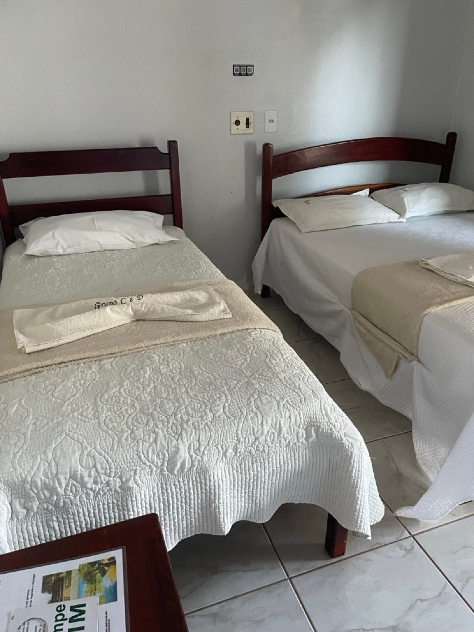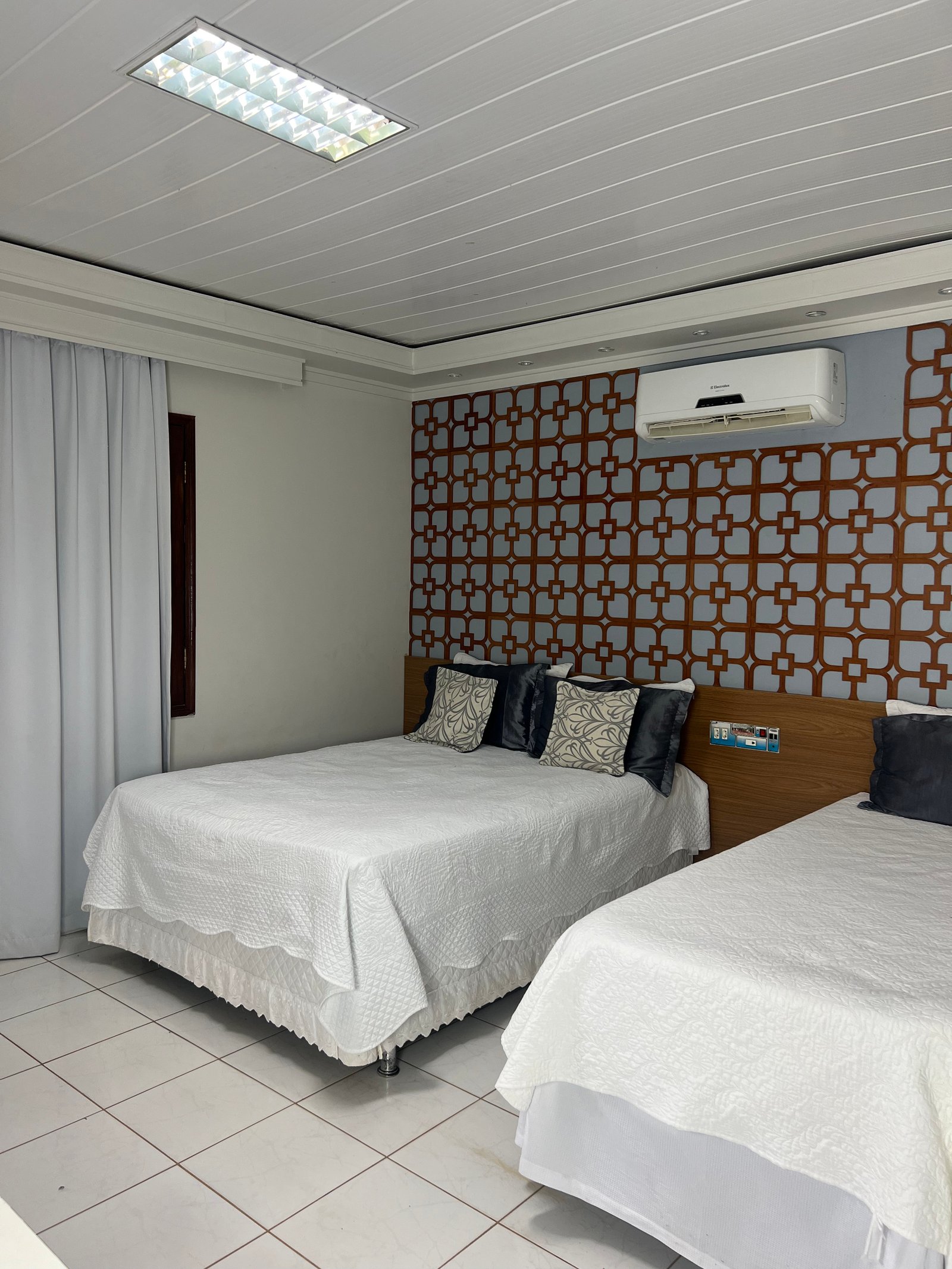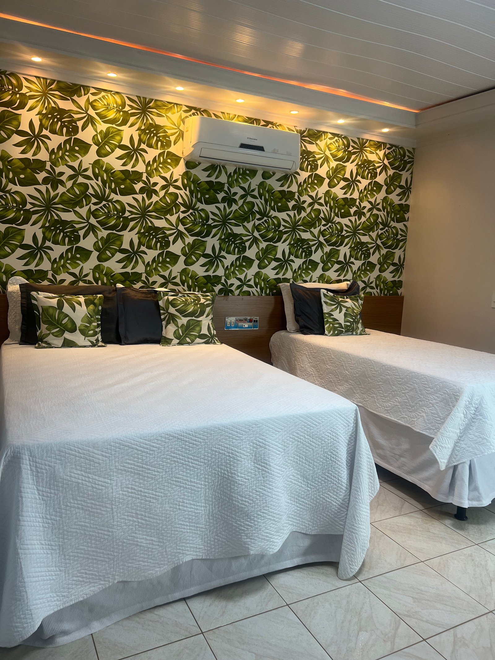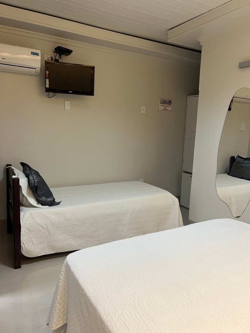Acomodações confortáveis de 20m2 com 1 cama de casal, 1 cama de solteiro, TV com canais fechados, ar-condicionado, frigobar, Wifi e estacionamento privativo.