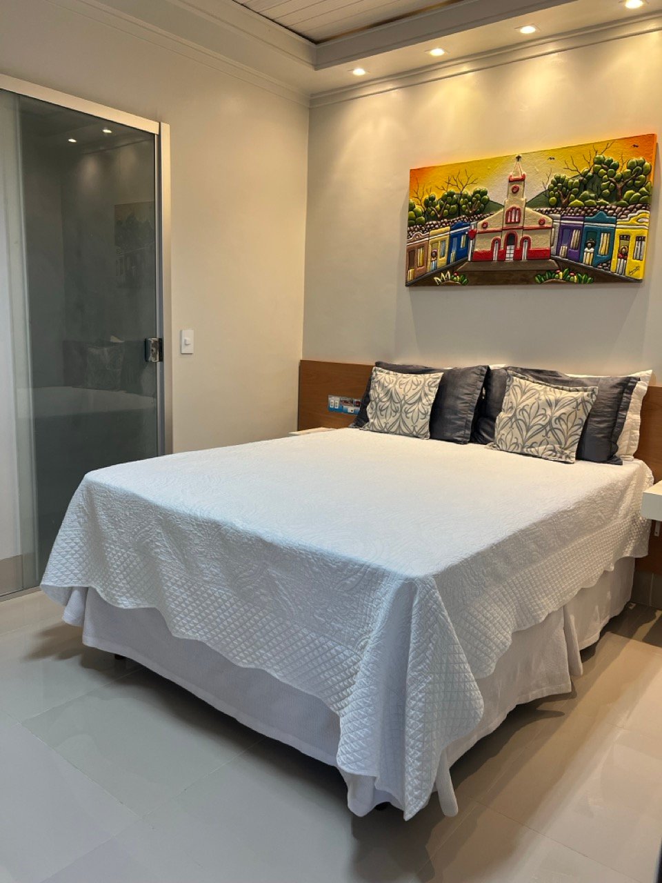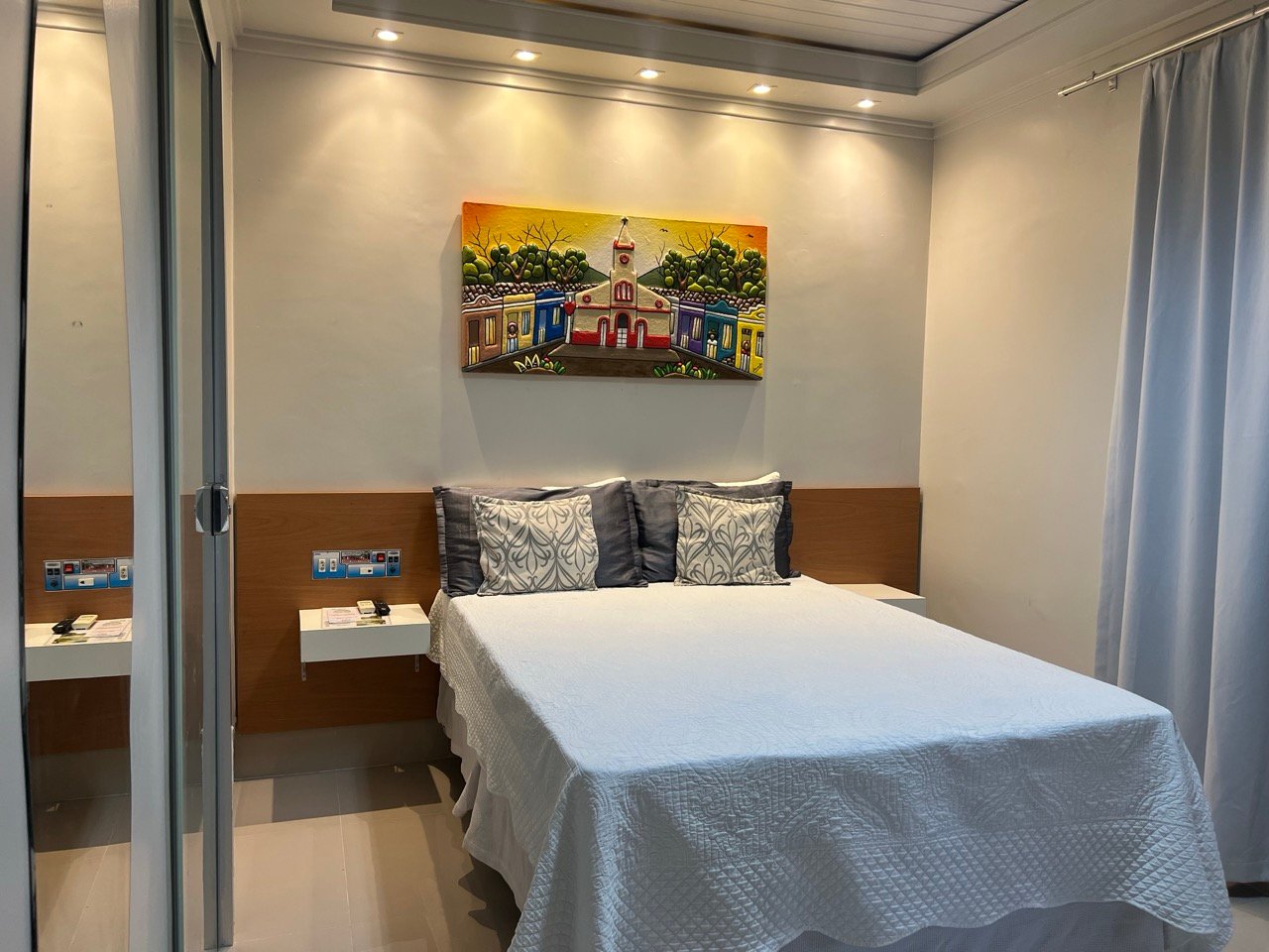 Acomodações confortáveis de 25m2 com 1 cama de casal, 1 cama de solteiro, TV com canais fechados, ar-condicionado, frigobar, Wifi e estacionamento privativo.